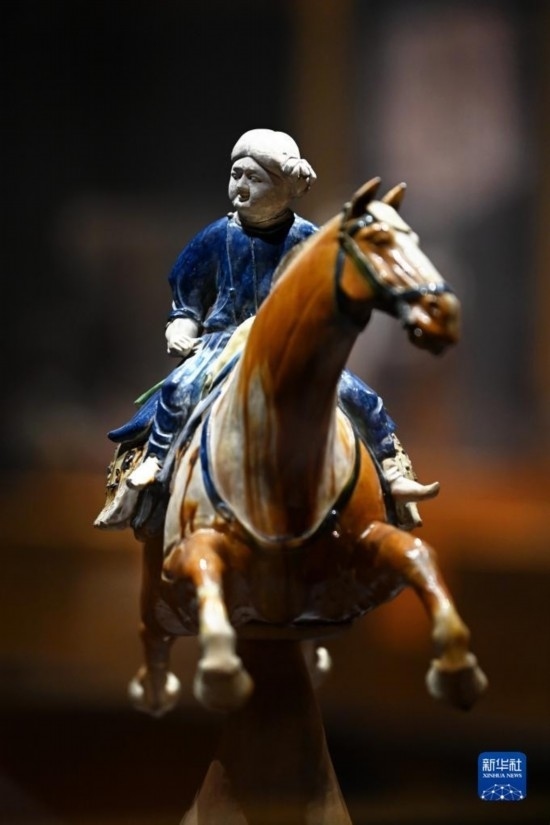 5月8日,游客在西安博物院參觀唐代三彩騰空馬。飛騰的三彩馬上騎有一胡俑,真實(shí)再現(xiàn)了絲綢之路上西域胡人急奔長安的生動形象。