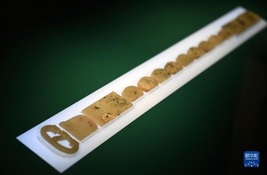這是在陜西歷史博物館拍攝的骨咄玉帶銙(5月11日攝)?!肮沁汀奔寸孢土_,是位于今塔吉克斯坦和阿富汗之間的中亞小國,史籍記載與唐王朝交往密切。