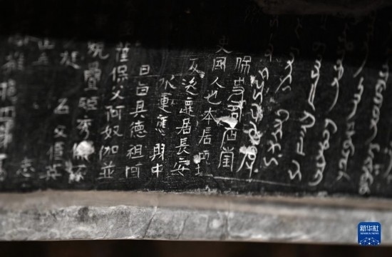 這是在西安博物院展出的史君墓石槨,槨門門楣上用漢文和粟特文刻著墓主墓志(5月8日攝)。墓主史君是北周涼州薩保,粟特人。石槨整體為中國傳統(tǒng)歇山頂?shù)钐檬浇ㄖ?,四壁浮雕?nèi)容和風(fēng)格則帶有鮮明的西域特色。