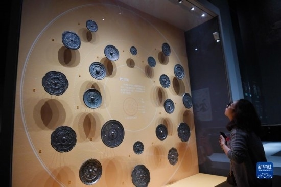 5月8日,游客在西安博物院參觀展出的銅鏡。