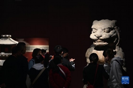5月9日,游客在西安碑林博物館內(nèi)參觀唐代石獅。古代中國的獅子多通過絲綢之路由外國進(jìn)貢而來。