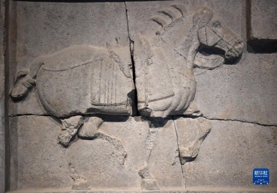 這是在西安碑林博物館內(nèi)拍攝的昭陵六駿石雕特勤驃(5月9日攝)。唐昭陵六駿石刻是為紀(jì)念六匹隨唐太宗李世民征戰(zhàn)疆場的戰(zhàn)馬而刻制的,其中特勤驃等馬匹帶有明顯的西域良馬特征。