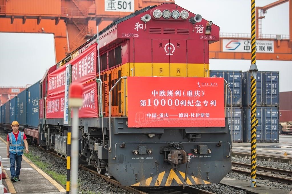 2022年6月23日,在重慶團結(jié)村中心站,鐵路工作人員從中歐班列(重慶)第10000列列車旁走過。當(dāng)日,第10000列中歐班列(重慶)從重慶團結(jié)村中心站順利駛出,奔赴德國杜伊斯堡。(新華社記者黃偉攝)