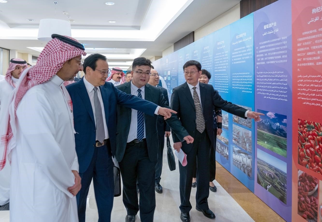 中阿嘉賓觀看寧夏“六新六特六優(yōu)”產(chǎn)業(yè)和中阿企業(yè)合作展板。主辦方供圖