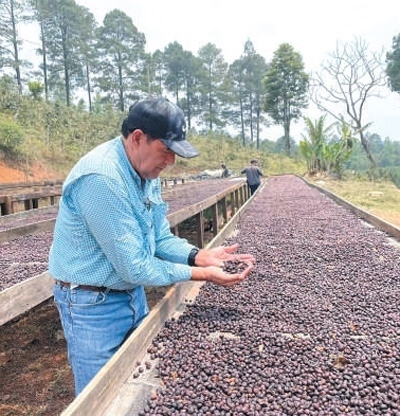 魯本·里維拉向記者展示晾曬中的咖啡豆。本報(bào)記者 彭 敏攝