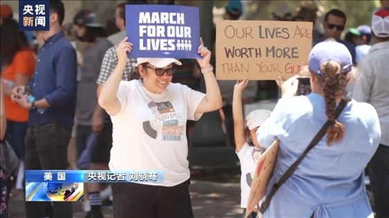 央視記者 劉驍騫:每年六月中旬,美國(guó)各地都會(huì)舉行大規(guī)模的控槍游行。這里是洛杉磯市中心的格蘭德公園,正在舉行的這種活動(dòng)的號(hào)召人之一就是“幽靈槍”的受害者。