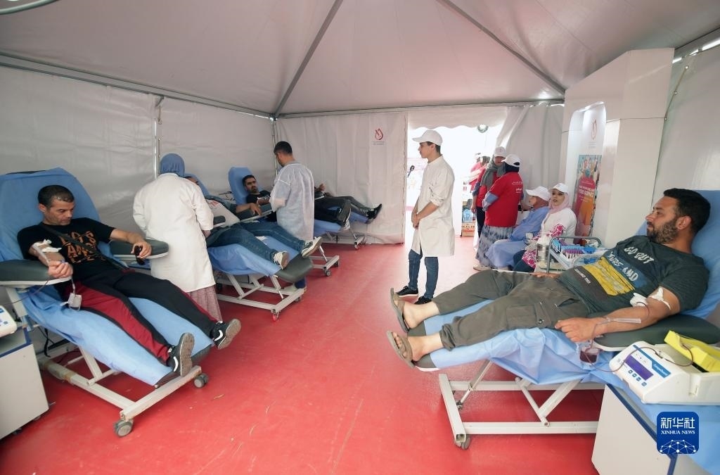 6月14日,志愿者在阿爾及利亞阿爾及爾一處獻(xiàn)血點(diǎn)獻(xiàn)血。