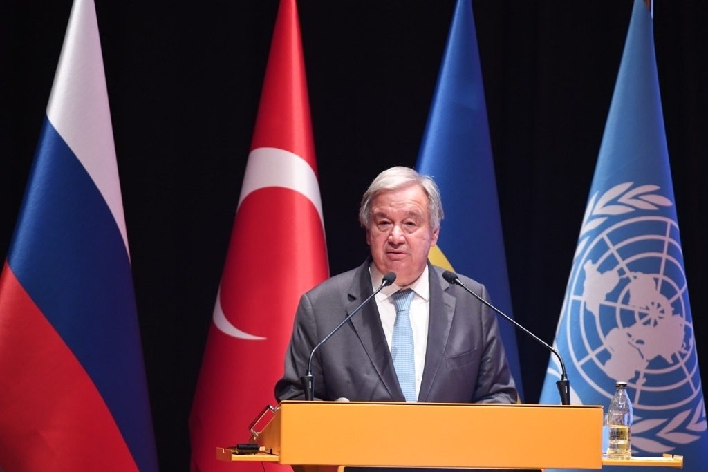 2022年8月20日,在位于土耳其伊斯坦布爾的土耳其國防大學(xué)內(nèi)的黑海糧食外運聯(lián)合協(xié)調(diào)中心,聯(lián)合國秘書長古特雷斯出席新聞發(fā)布會。新華社記者沙達(dá)提攝