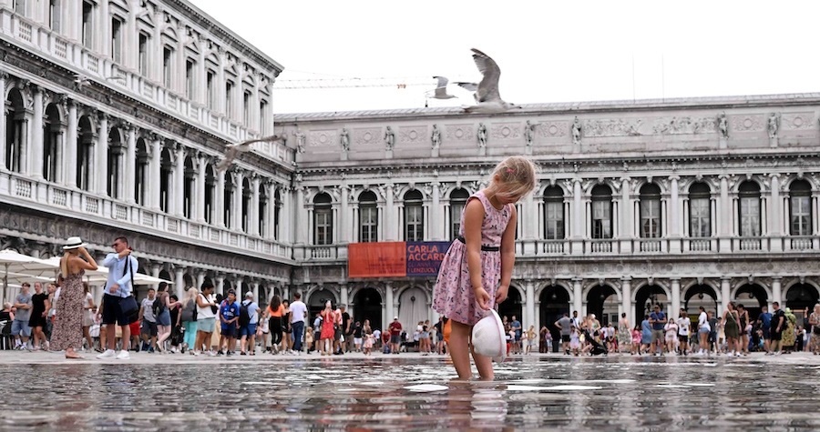 當(dāng)?shù)貢r(shí)間2023年8月4日,意大利威尼斯,兒童在積水中玩耍。