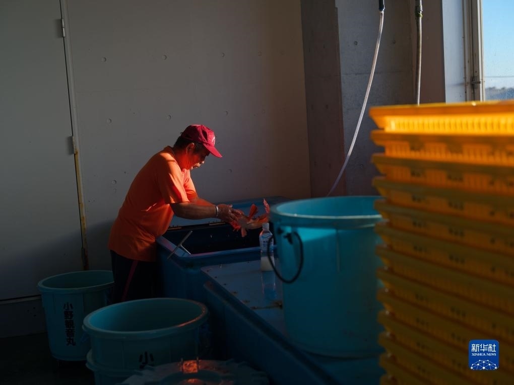 8月23日,打漁歸來的小野春雄在日本福島縣新地町的漁港處理捕獲的魚。新華社記者 張笑宇 攝