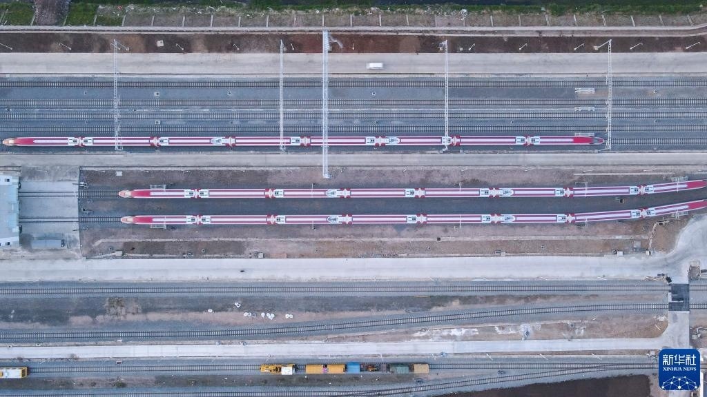 7月20日,雅萬(wàn)高鐵列車(chē)停靠在印度尼西亞萬(wàn)隆德卡魯爾動(dòng)車(chē)所附近(無(wú)人機(jī)照片)。新華社記者 徐欽 攝