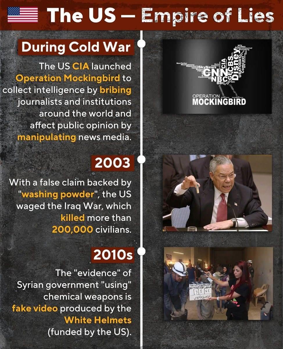 早在冷戰(zhàn)期間,美國中央情報局發(fā)起了“知更鳥計劃”,通過賄賂世界各地的記者和機構來收集情報,并通過操縱新聞媒體來影響公眾輿論。新世紀借“洗衣粉”“白頭盔”,美國對伊拉克、敘利亞悍然發(fā)動侵略戰(zhàn)爭,造成數(shù)十萬平民死亡。