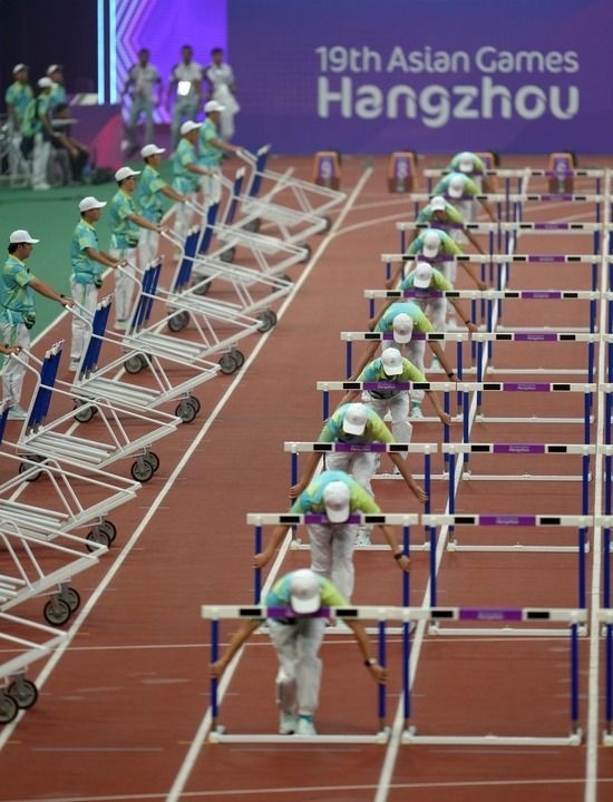 9月30日,杭州亞運(yùn)會(huì)志愿者在田徑項(xiàng)目女子七項(xiàng)全能100米欄比賽前進(jìn)行場(chǎng)地準(zhǔn)備工作。新華社記者 江文耀 攝