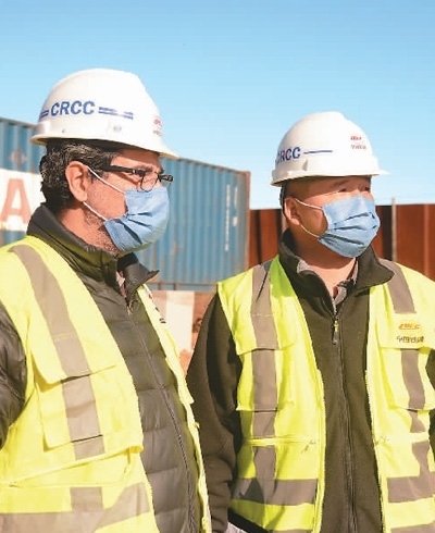 中外員工在智利5號(hào)公路塔奇段項(xiàng)目上討論道路交通導(dǎo)改方案。