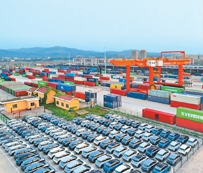 11月28日,在位于江西省贛州市南康區(qū)的贛州國(guó)際陸港,比亞迪新能源汽車(chē)將通過(guò)鐵路運(yùn)送至深圳鹽田港出口國(guó)外。