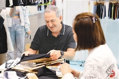 7月19日,在美國(guó)紐約舉辦的第24屆中國(guó)紡織品服裝貿(mào)易展覽會(huì)上,客商(左)在一家中國(guó)上海的企業(yè)展位選看面料。