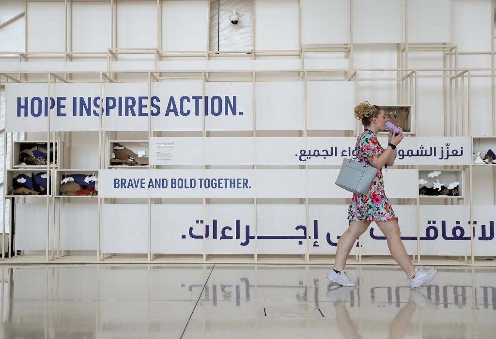 12月12日,在阿聯(lián)酋迪拜,一名女子走在聯(lián)合國(guó)氣候變化迪拜大會(huì)會(huì)場(chǎng)內(nèi)。新華社記者王東震攝