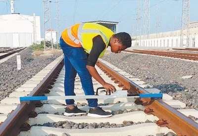 奧斯曼在亞吉鐵路的一座車站進(jìn)行巡檢。中國土木工程集團(tuán)吉布提有限公司供圖