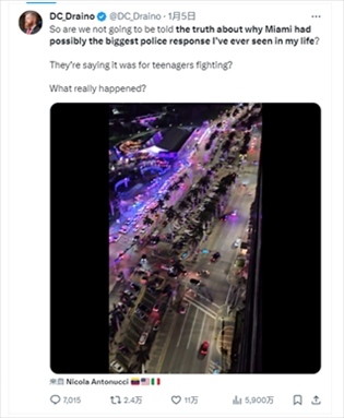 報(bào)道還提到,X平臺(tái)上另一篇帖子內(nèi)容稱,邁阿密警方此次出警執(zhí)法可能是“我一生中見過規(guī)模最大”的警方行動(dòng),然而官方?jīng)]有告知公眾真相,“他們說那是青少年打斗,到底發(fā)生了什么?”這則帖子內(nèi)容目前已獲5900萬閱讀量?!?/p>
