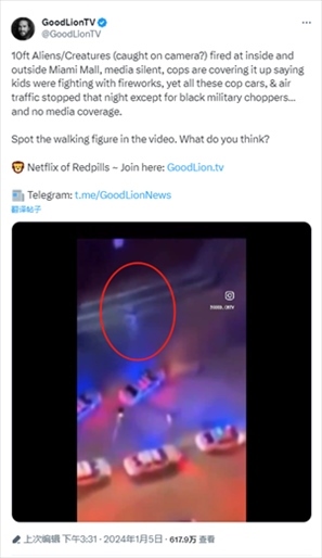 報(bào)道提到,一個(gè)推廣涵蓋科幻、陰謀論等內(nèi)容電影和紀(jì)錄片的X平臺(tái)賬號(hào)曬出現(xiàn)場(chǎng)視頻稱,“10英尺高的外星人/生物(被攝像機(jī)拍到?)朝邁阿密購(gòu)物中心內(nèi)外開火,媒體沉默,警察掩蓋說孩子們?nèi)挤艧熁ú⒋蚨罚欢撕谏娪弥鄙龣C(jī),所有警車和空中交通都在那天晚上一動(dòng)不動(dòng)……這卻沒有媒體報(bào)道。視頻中出現(xiàn)了行走的身影。你覺得呢?”↓
