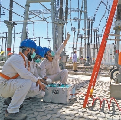 在巴基斯坦默蒂亞里—拉合爾直流輸電項(xiàng)目現(xiàn)場(chǎng),中巴工程師對(duì)設(shè)備開展日常檢修。本報(bào)巴基斯坦分社 薩義德·邁赫迪攝