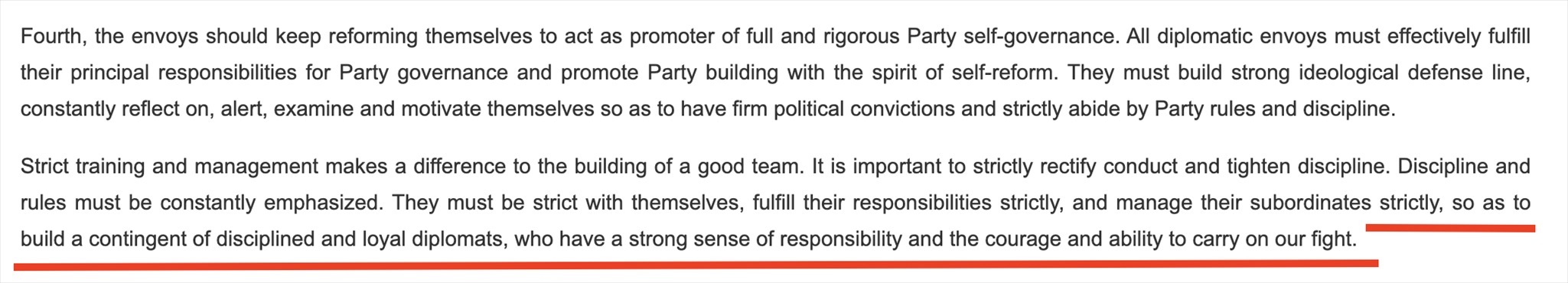 “鐵軍”一詞常見于政府文件或領(lǐng)導(dǎo)人講話,更多的是強(qiáng)調(diào)工作作風(fēng)和紀(jì)律。在近年來中國領(lǐng)導(dǎo)人講話中,曾多次出現(xiàn)“紀(jì)律監(jiān)察鐵軍”“生態(tài)環(huán)境保護(hù)鐵軍”等表述。中國領(lǐng)導(dǎo)人在接見與會使節(jié)時的講話中說:“打造一支對黨忠誠、勇于擔(dān)當(dāng)、敢斗善斗、紀(jì)律嚴(yán)明的外交鐵軍?!蓖饨徊烤W(wǎng)站對這句話的英文翻譯(見下圖)同樣強(qiáng)調(diào)外交隊伍的紀(jì)律、責(zé)任和勇氣。作為通行做法,世界各國對本國外交人員都有著很高的紀(jì)律要求。