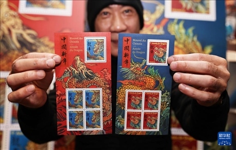 這是1月26日在法國(guó)巴黎拍攝的龍年生肖紀(jì)念郵票。新華社記者 高靜 攝