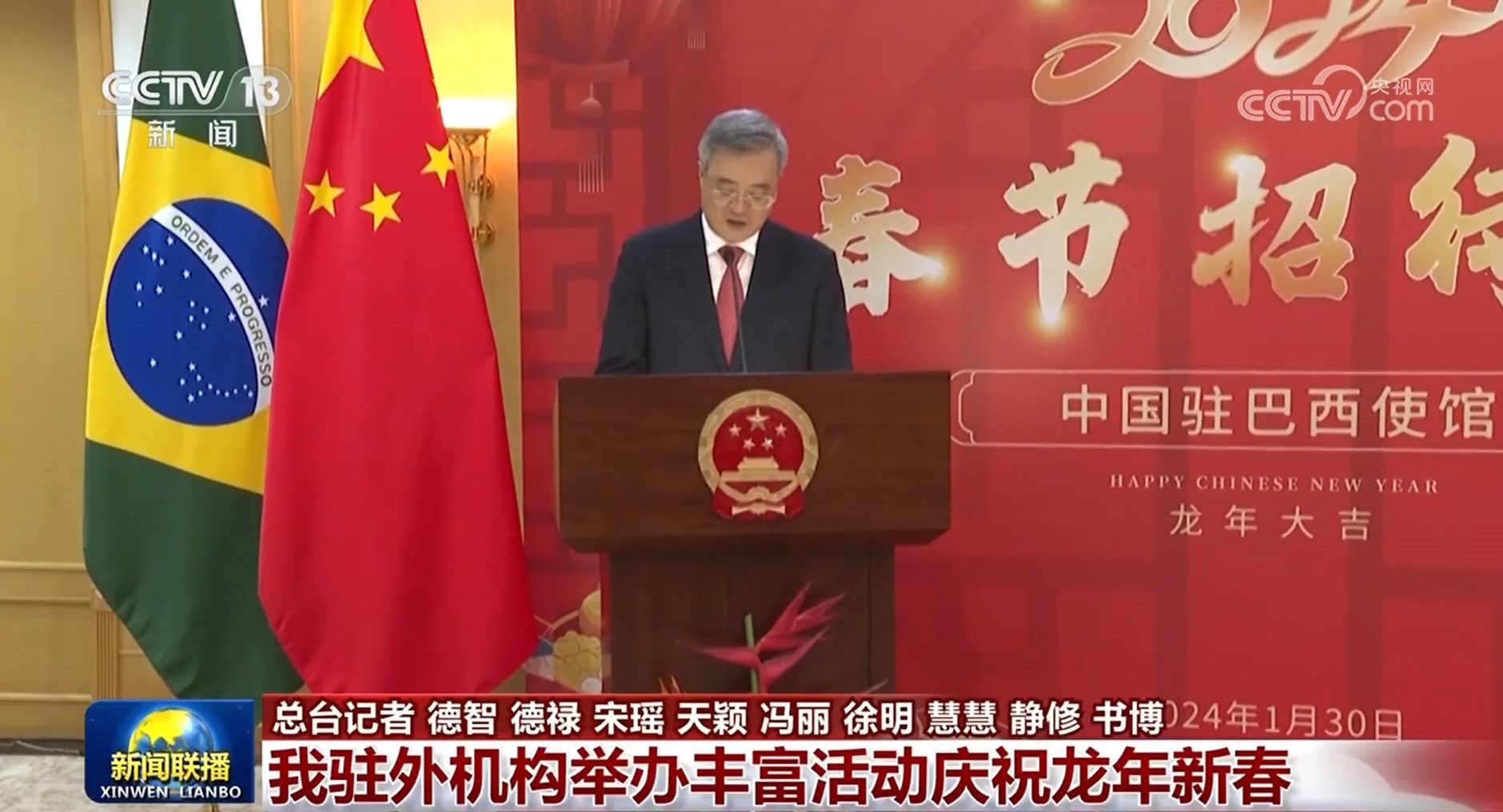 在中國(guó)駐巴西使館舉行的新春招待會(huì)上,巴西政府、商企、媒體等各界友好人士,以及華僑華人等歡聚一堂,共迎甲辰龍年。
