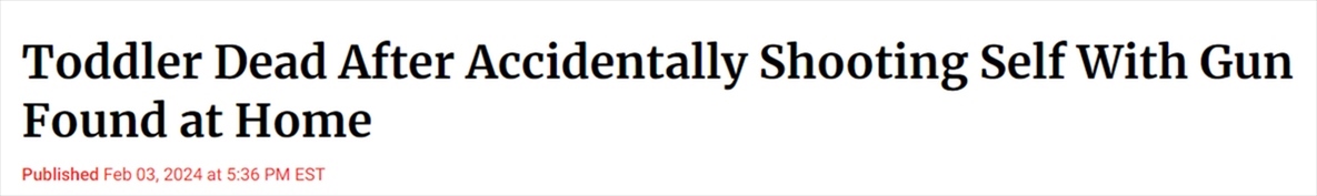 文章進一步指出,槍支理所應當被視為致命武器來對待,許多美國兒童死亡的悲劇都是由于槍支漫不經心的存放所造成的。在美國,超過460萬名兒童生活在可以接觸到未被鎖起來或者無人看管的槍支的家庭之中。并且,20%的孩子在父母不知情的情況下在家里拿過槍。這帶來的結果就是,美國每天有8名兒童因意外槍擊死亡或受傷。