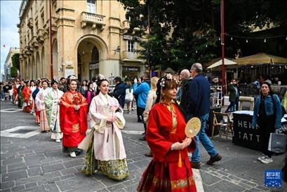 馬耳他民眾和當(dāng)?shù)赜慰?7日在地中海古城瓦萊塔的街道上欣賞到一場美妙的“漢服秀”。20多名中外女性漢服愛好者身著漢服,或手持團(tuán)扇,或提著宮燈,在地中海的微風(fēng)中款款而行。