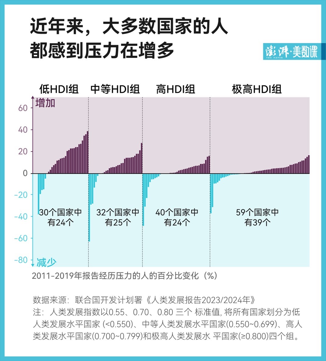 報告顯示,2011至2019年間,大多數(shù)國家自主報告“在昨天大部分時間里”經(jīng)歷壓力的人數(shù)占比增加。