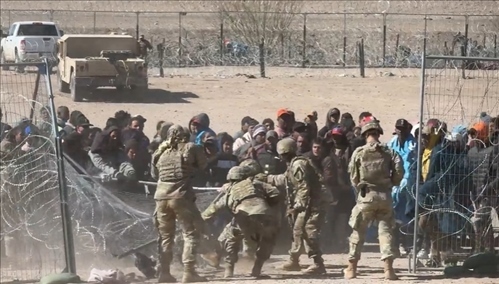 視頻畫面顯示,大批成年男性沖破州政府設(shè)置的鐵絲網(wǎng),將得州國民警衛(wèi)隊(duì)的一些士兵撞倒,并跑向邊界墻。 現(xiàn)場一片混亂,可以聽到有士兵對(duì)移民大叫“滾回去!”