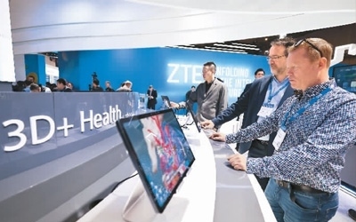2月28日,西班牙巴塞羅那舉行的2024年世界移動(dòng)通信大會(huì)上,一名參觀者在中興展臺(tái)體驗(yàn)全新升級(jí)的5G+人工智能裸眼3D平板電腦。新華社記者 高 靜攝