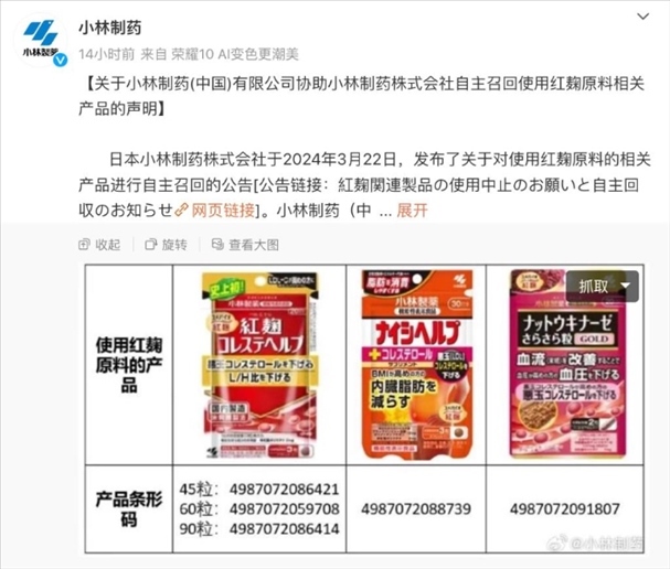 由于小林制藥生產(chǎn)的紅曲原料超過80%出售給其他公司,不少民眾開始擔(dān)憂是否已服用了含有問題成分的其他公司產(chǎn)品。社交媒體上一些網(wǎng)友留言表示,“紅曲色素也讓人不安”“暫時避開含紅曲的食品”等。一些生產(chǎn)商急忙和小林制藥撇清關(guān)系,聲明本公司生產(chǎn)和銷售的產(chǎn)品完全沒用到小林制藥的紅曲原料。