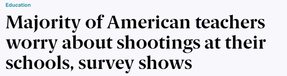 報(bào)道稱,2023年,美國(guó)發(fā)生的校園槍擊事件數(shù)量達(dá)到了歷史新高。在接受皮尤調(diào)查的受訪者中,59%的人對(duì)校園槍擊表示擔(dān)心,其中18%的人說自己對(duì)此感到“非常”或者“極度”擔(dān)心。只有7%的受訪教師稱,他們完全不擔(dān)心校園槍擊的發(fā)生。