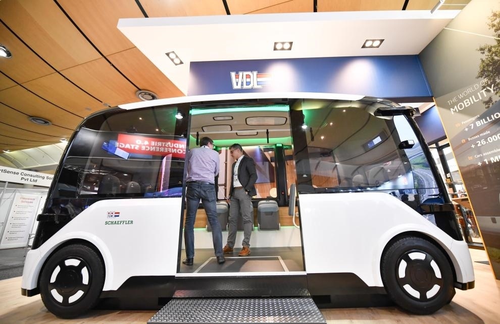 ?4月23日,人們在德國漢諾威工博會上參觀一款無人駕駛汽車。新華社記者任鵬飛攝
