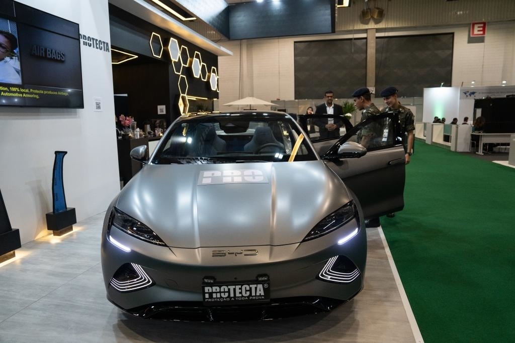 ?4月4日,在巴西圣保羅舉行的巴西防務展上,參觀者體驗一輛經(jīng)過防彈加固的比亞迪海豹電動汽車。新華社記者王天聰攝