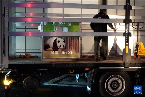 4月29日,在西班牙馬德里,工作人員轉(zhuǎn)運大熊貓“金喜”。新華社發(fā)(西班牙馬德里動物園供圖)