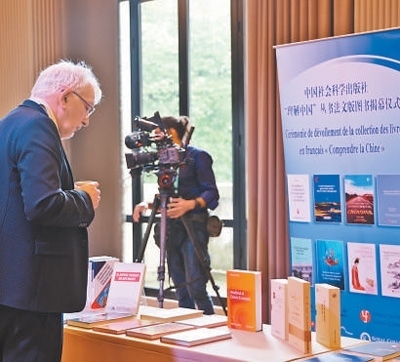 5月3日,中國(guó)社會(huì)科學(xué)出版社“理解中國(guó)”叢書法文版圖書揭幕儀式在法國(guó)巴黎舉行。圖為現(xiàn)場(chǎng)嘉賓在展位前駐足了解相關(guān)圖書。本報(bào)記者 楊 一攝