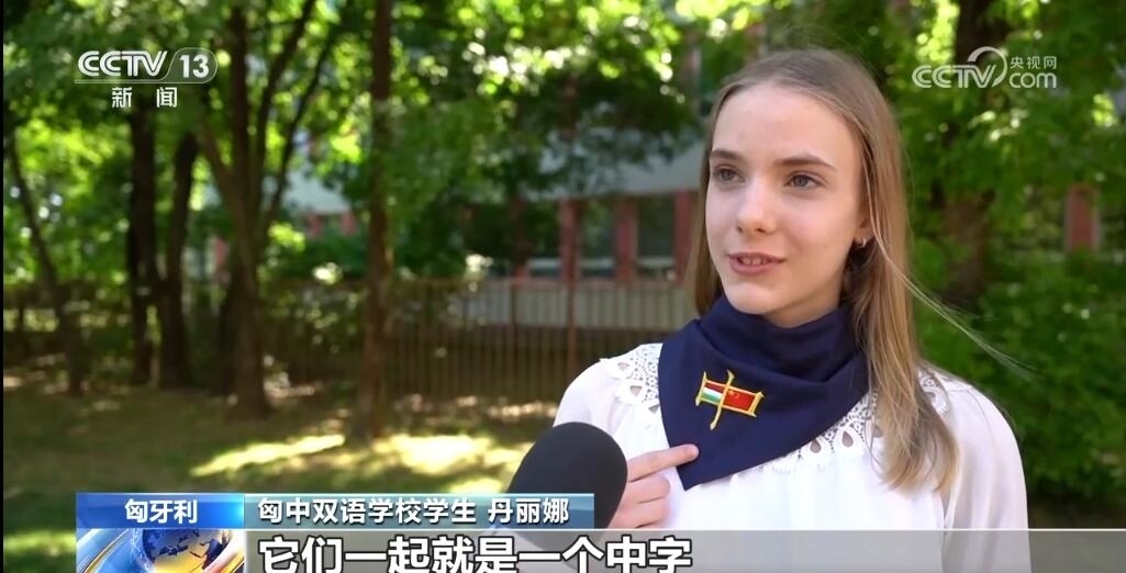 匈中雙語(yǔ)學(xué)校學(xué)生丹麗娜說(shuō):“我很開心可以見到他們。我說(shuō),您好,我是匈中雙語(yǔ)學(xué)校的丹麗娜,歡迎來(lái)到匈牙利。這個(gè)領(lǐng)帶上可以看到匈牙利國(guó)旗和中國(guó)國(guó)旗,它們一起就是一個(gè)中字,這領(lǐng)帶代表兩個(gè)國(guó)家的友誼。我學(xué)了10年漢語(yǔ),將來(lái)這個(gè)語(yǔ)言會(huì)給我打開很多工作的新門?!?/p>