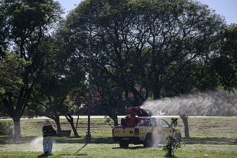 △當(dāng)?shù)貢r(shí)間4月6日,阿根廷布宜諾斯艾利斯一個(gè)公園里,工人在噴灑化學(xué)藥劑滅蚊。