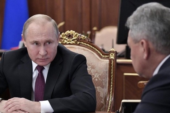 2019年2月2日,在俄羅斯莫斯科,俄羅斯總統(tǒng)普京(左)會晤國防部長紹伊古和外交部長拉夫羅夫(不在畫面中)。新華社/衛(wèi)星社