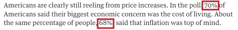 在《衛(wèi)報(bào)》發(fā)布的民意調(diào)查中,有70%的受訪者表示,他們最大的經(jīng)濟(jì)擔(dān)憂是生活成本;大約同樣比例的人(68%)說(shuō),通貨膨脹是他們最關(guān)心的問(wèn)題。
