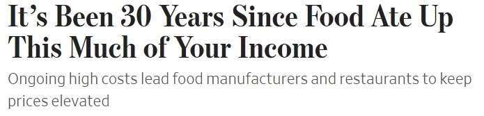 《華爾街日?qǐng)?bào)》報(bào)道稱,持續(xù)的高成本導(dǎo)致食品制造商和餐館繼續(xù)抬高價(jià)格,“食物支出‘吃掉’這么多收入,已經(jīng)是30年前的事”。