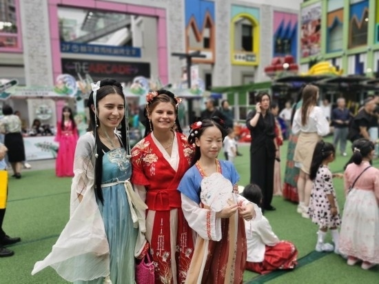 6月9日,端午小長(zhǎng)假第二天,在上海金橋的一處商業(yè)中心里,身著中國(guó)古代服飾的外國(guó)人與中國(guó)兒童合影。新華社記者 陳愛平 攝