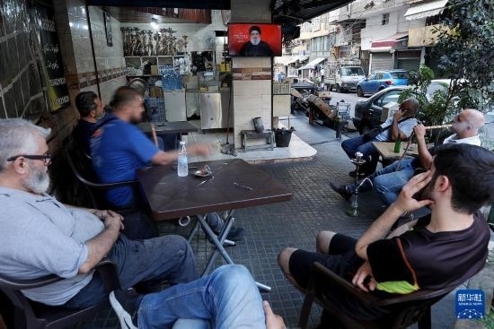 9月19日,在黎巴嫩貝魯特,人們收看真主黨領(lǐng)導(dǎo)人納斯魯拉發(fā)表電視講話。新華社發(fā)(比拉爾·賈維希攝)