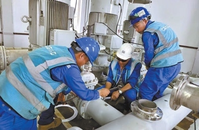 工作人員正在對阿聯(lián)酋烏姆蓋萬海水淡化設(shè)備管道系統(tǒng)進(jìn)行維護(hù)。盧偉寧攝