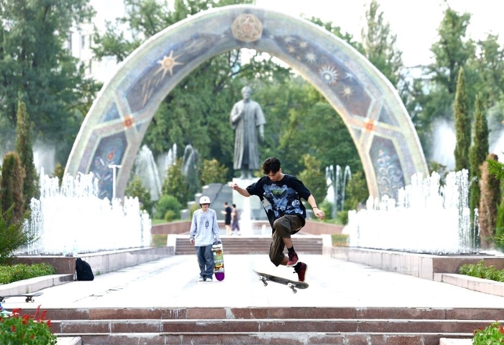 ↑青少年在杜尚別的魯達基公園練習(xí)滑板。 新華社記者 姚大偉 攝