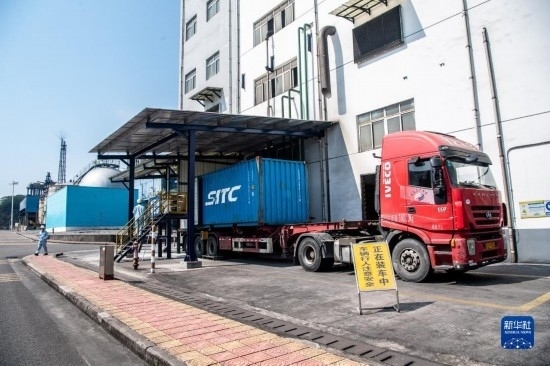 10月17日,在中國石化集團(tuán)重慶川維化工有限公司,工作人員在將以乙炔為原料生產(chǎn)的化工產(chǎn)品進(jìn)行打包裝車。
