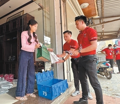 中午時(shí)分,記者來到老撾首都萬象市塔鑾附近的一處便民服務(wù)點(diǎn)。摩托車來來往往,不時(shí)有當(dāng)?shù)鼐用駚泶耸瞻l(fā)電商商品。工作人員正忙著將收到的商品掃描、稱重、歸類、打包,趕在傍晚送到轉(zhuǎn)運(yùn)中心發(fā)往目的地。